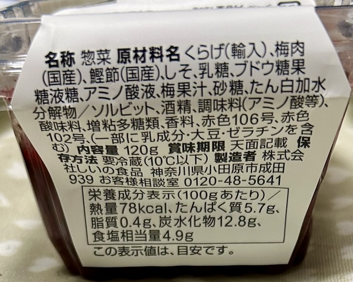 側面には原材料名や栄養成分表示が記載されています。主原料がクラゲと梅肉であることが確認でき、保存料や調味料も記載されています。
