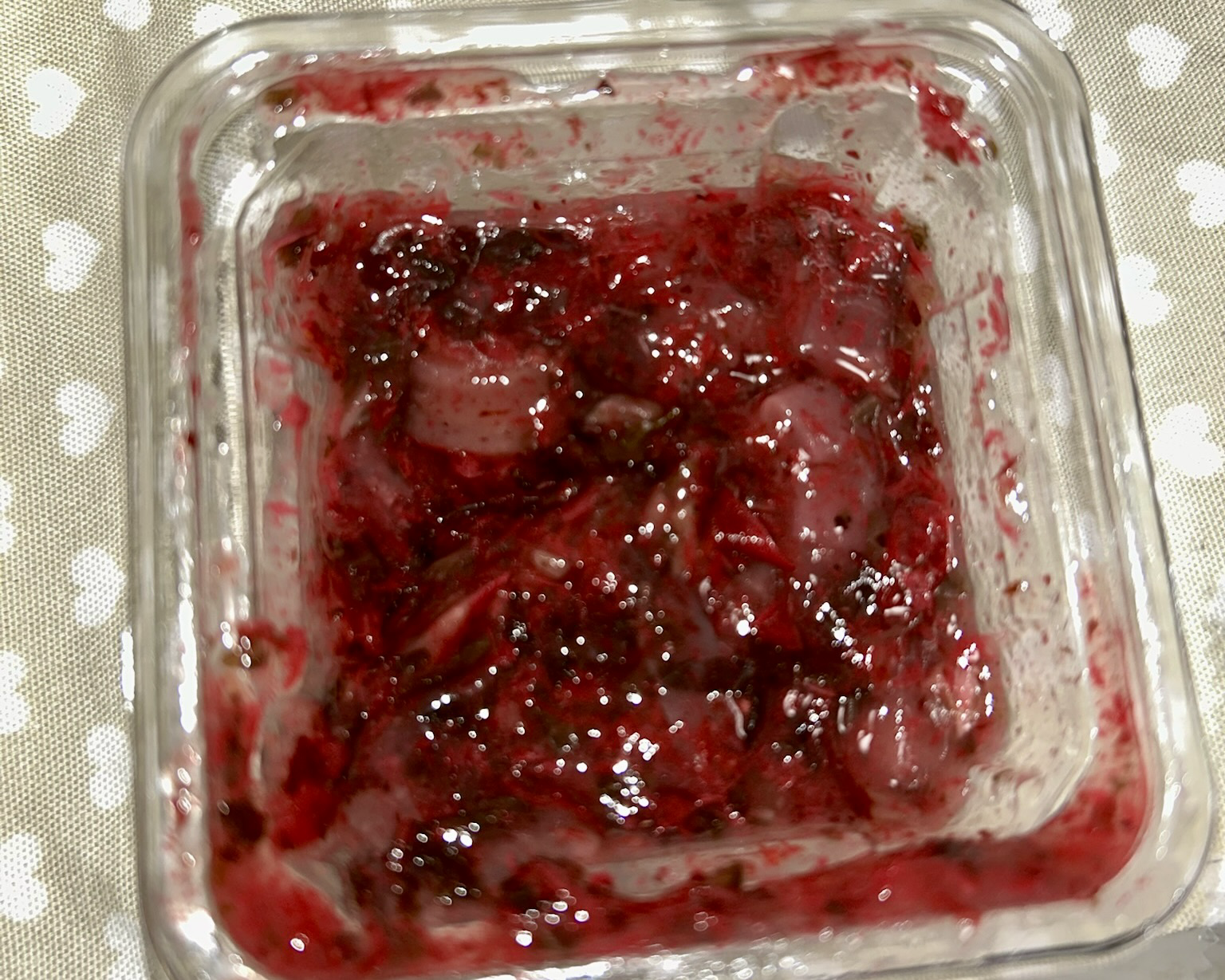 パッケージを開けると、透明なクラゲに赤い梅肉がまぶされた状態で入っています。見た目は確かに少し独特で、初見では戸惑うかもしれませんが、これがクラゲの自然な姿です。梅肉の赤い色がアクセントになっています。