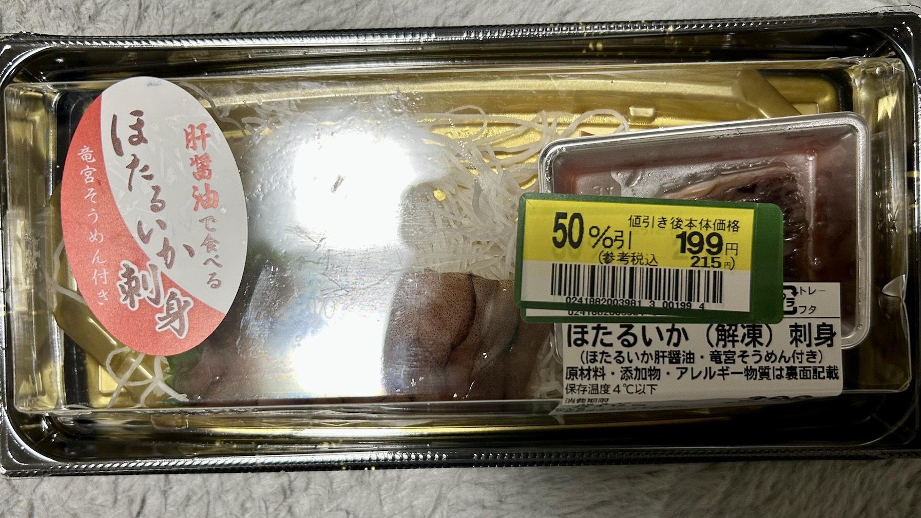ホタルイカの刺身は、小さな体に旨味が詰まった春の味覚の代表格です。215円(半額)という価格で購入できたのは非常にラッキーで、その価値は十分に感じられました。