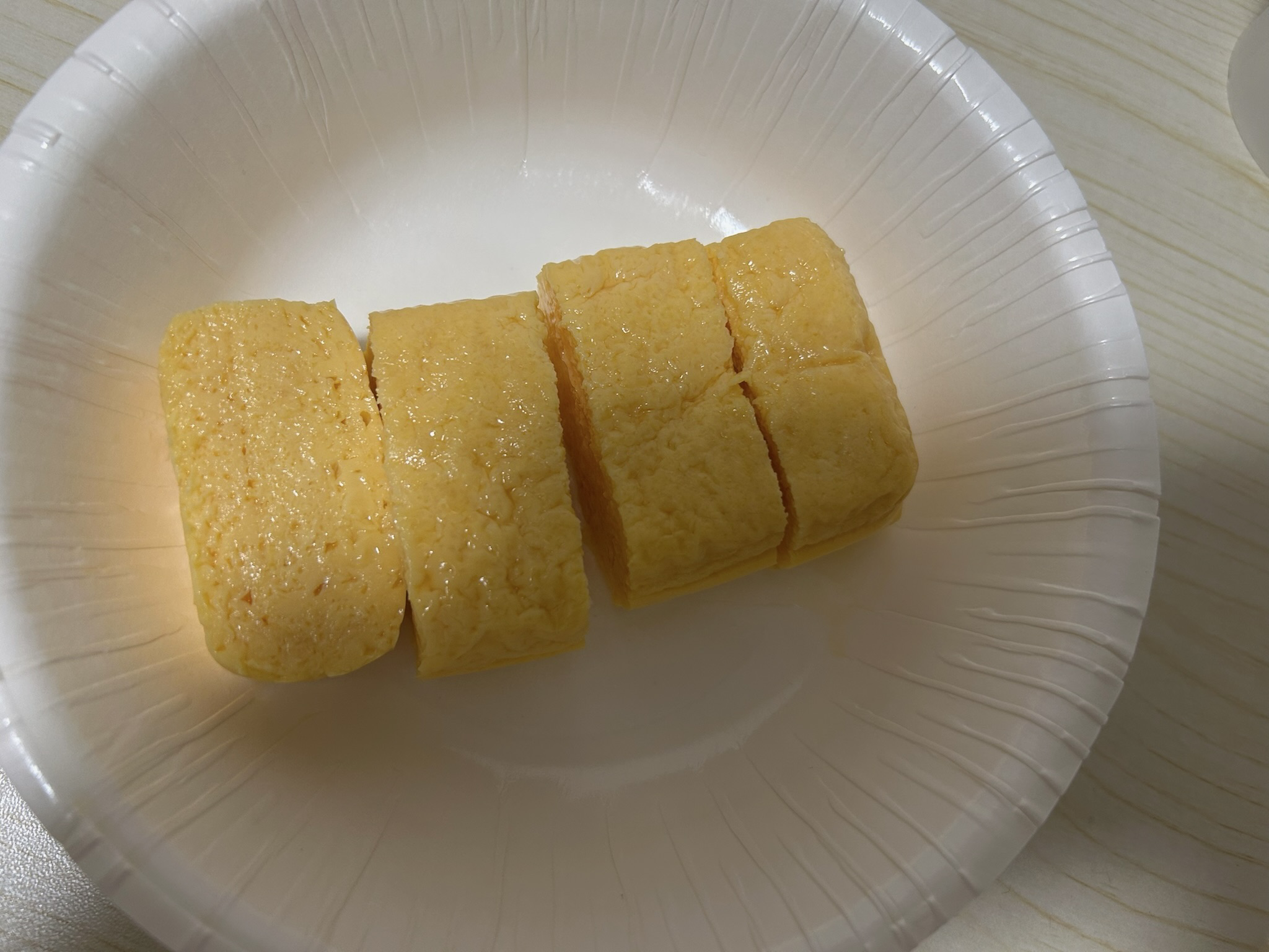 透明な容器に入っただし巻き卵は、思った以上に大きなサイズで、一人は「これなら満足感がありそう」と期待を込めて話していました。黄色い卵の色合いが食欲をそそります。