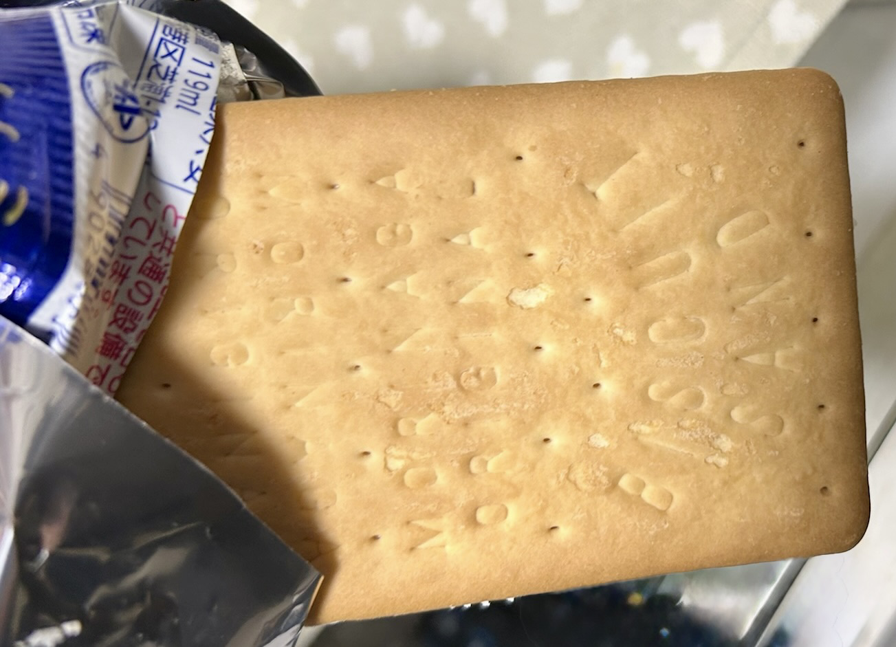 パッケージから取り出すと、「BISCUIT SAND」の文字がビスケット表面にプリントされています。このような細かい工夫が、商品への愛着を高める要素として機能しています。二人とも「こういう遊び心があるのが嬉しい」と感じました。
