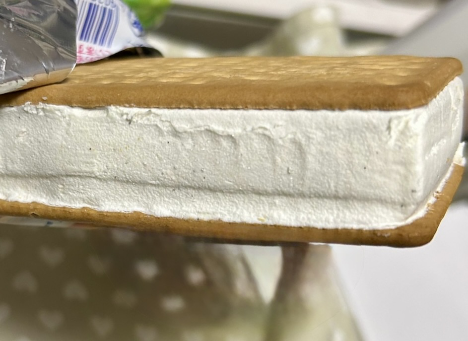 側面から見ると、アイスクリームがしっかりと詰まっているのが確認できます。ビスケット部分との比率も良好で、一口で両方の味を楽しめるバランスの良い構造になっています。