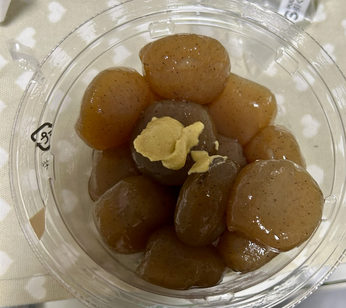 今回私たち二人は、スーパーの惣菜コーナーで「味しみ玉こんにゃく」を発見しました。一人は「玉こんにゃくって山形の名物だよね、からし付きなら本格的かも」と興味を示し、もう一人は「最近こんにゃく食べてないから、ダイエットにも良さそう」という話になり、健康的なおやつとして購入することにしました。