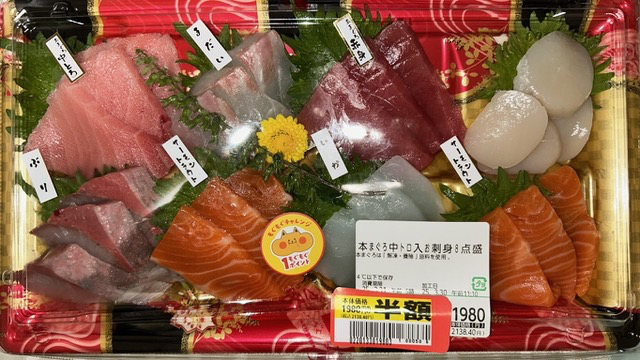 第一印象と発見: 「半額だったので選んだが、よくみたらサーモン2つあった」という観察は、盛り合わせの構成における興味深い発見でした。この情報から以下の分析が可能です: