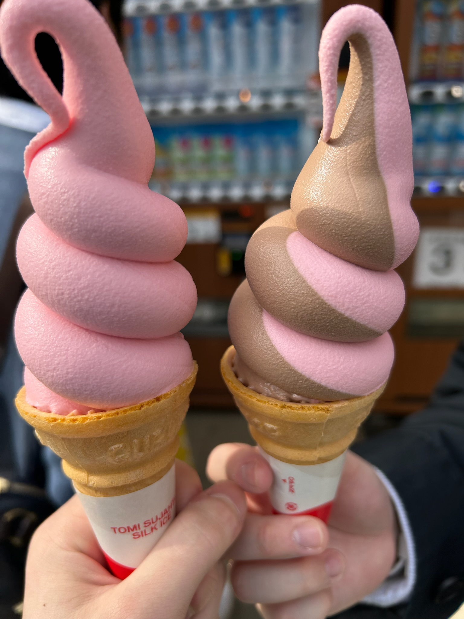 ということで桜餅と、ストロベリーアンドバニラのソフトクリームを食べた。